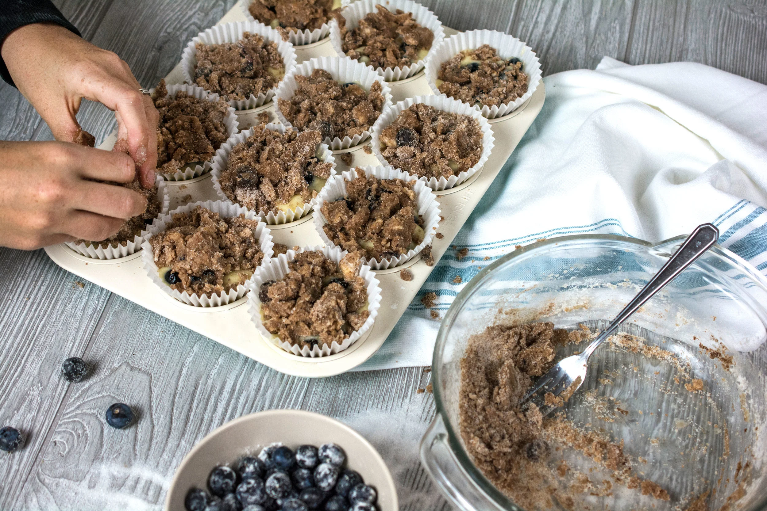Measure ¼ cup of muffin batter and set aside for crumb topping. Fold blueberries into batter. Spoon into muffin cups.